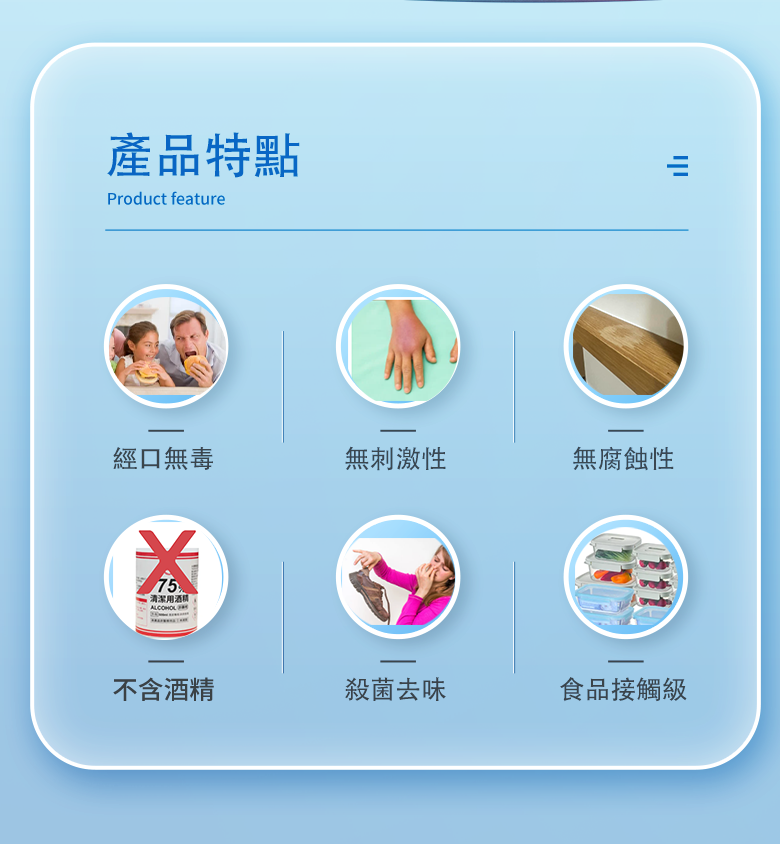 可直接加在自來水或是清潔劑,高濃度穩定技術,可以自來水稀釋2000~5000倍即可達抗菌效果。